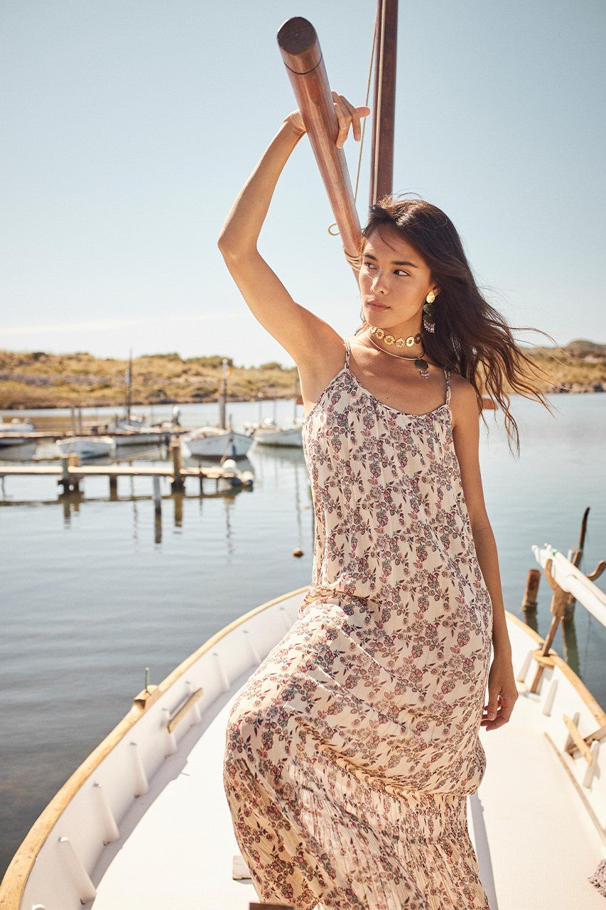 Abito lungo in viscosa con doppie spalline regolabili. Romantica stampa floreale con dettagli in lurex.